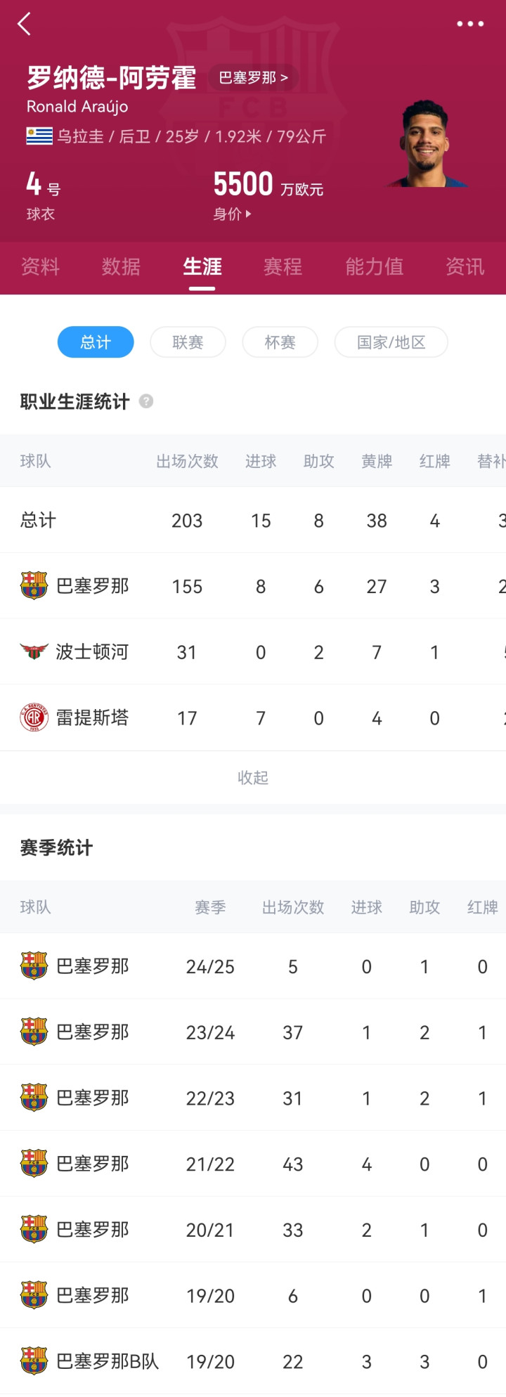 25岁的乌拉圭中卫阿劳霍,2018年加盟巴萨,至今代表球队出战155场比赛。本赛季阿劳霍在长期伤缺后复出,代表巴萨出场5次。今年冬窗,阿劳霍曾与尤文传出绯闻,最终阿劳霍还是选择与巴萨续约,他原本与巴萨的合同将在2026年6月到期。